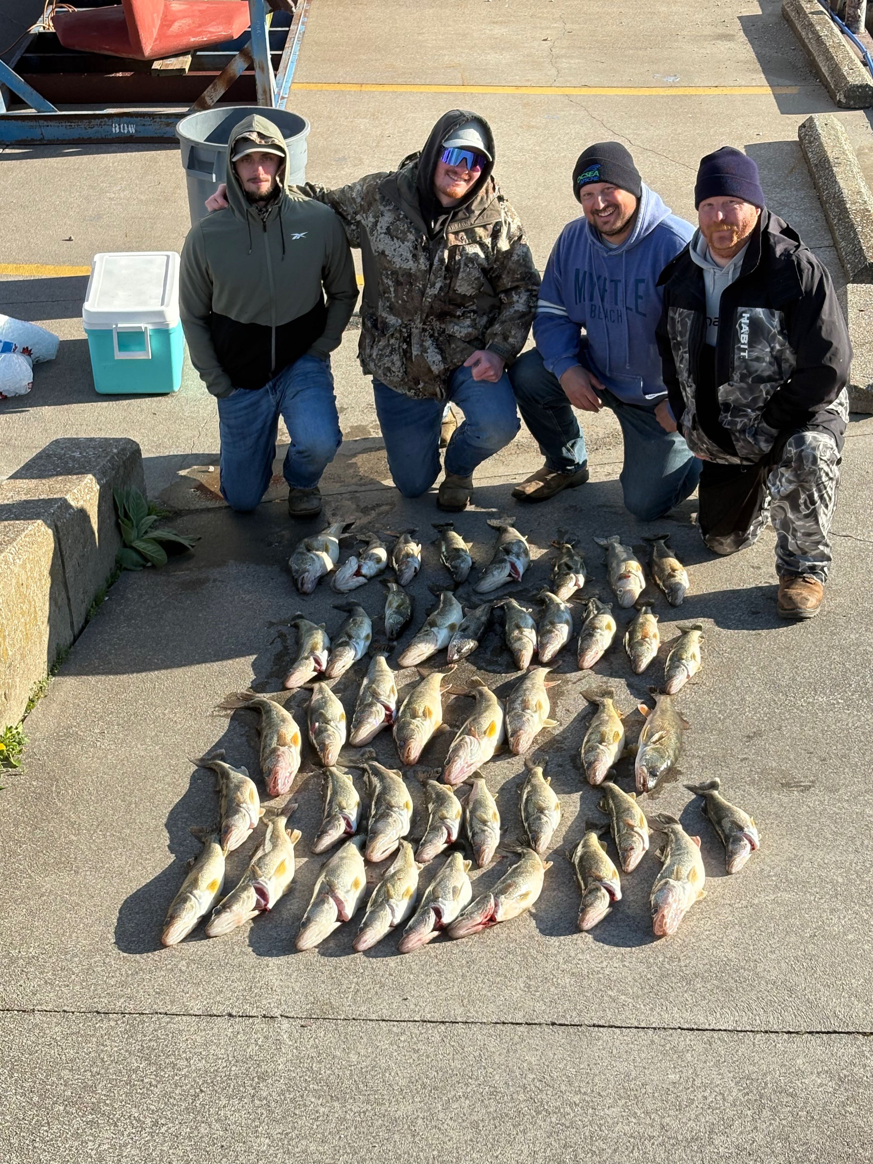 the wind was howling today but my 6 person charter prevaled!! 42 fish hit the deck and this crew had to amkw a run to Walmart to buy a bigger cooler for their fish!!!! We were doubled up many times throughout the day and even had 3 and 4 hooks ups at a time. the fishing in Lorain is as hot as its ever been. we brought in 3 fish Ohio(28 inches or longer)